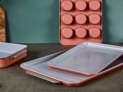 esențiale pentru copt pentru orice bucătărie, întâlniți duo-ul de foi de copt – o pereche gata de cuptor a foilor noastre de copt mari de 18×13″ și 15×10″ medii. Având un interior acoperit cu ceramică, netoxică, natural, aceste foi fac coacerea sănătoasă (și curățarea) mai ușoară ca niciodată.